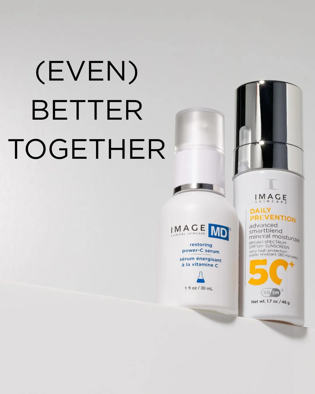 Das IMAGE Skincare MD Restoring Power‑C Serum und die IMAGE Skincare Daily Prevention Moisturizer SPF 50 ergänzen sich ideal in der täglichen Morgenroutine. Das Power-C Serum versorgt die Haut mit hochkonzentriertem Vitamin C, unterstützt einen ebenmäßigen Teint und schützt vor freien Radikalen. Die Daily Prevention Pflege spendet Feuchtigkeit und schützt die Haut gleichzeitig zuverlässig vor UV-Strahlen. Zusammen helfen beide Produkte, die Haut vor vorzeitiger Hautalterung zu bewahren und ihr ein frisches, strahlendes Aussehen zu verleihen.